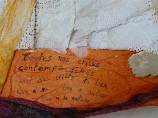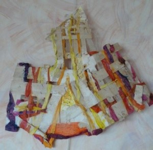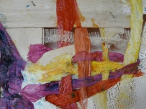 Nourrie par l’article du blog : «  Les Tisserands » de fin décembre 2016, j’ai eu besoin de tenter, concrètement, de réparer des trames déchirées, abîmées, fragiles ; entre une trame de cageot, des bandes plâtrées, des papiers de couleurs à tisser, et des phrases à croiser : une construction en est née !