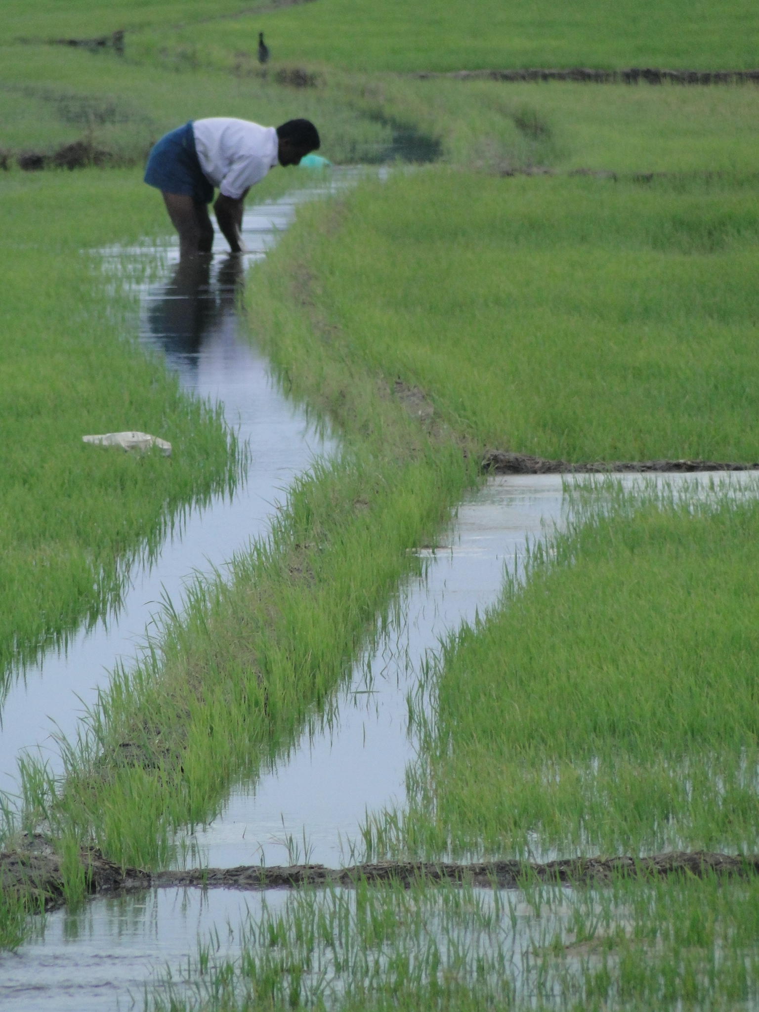 Elle ne lit pas. Sait – elle lire ? Elle est calme, patiente, elle contemple le paysage, et sa contemplation rejoint la mienne. Nous regardons les différentes gammes de vert ou de couleurs de terre selon que nous traversons des zones de rizières irriguées ou des zones arides. De temps en temps, un attelage, des enfants qui se baignent dans une mare et s’éclaboussent en riant, une carriole chargée de noix de coco, une vache efflanquée qui somnole, une personne qui fait sa lessive. Sur les quais, des vendeurs de beignets épicés et de riz. Dans le wagon, un vendeur de thé passe de temps en temps avec sa petite citerne. Elle nous regarde aussi, nous quatre Européens , et semble s’étonner de notre attirail : les bouquins, le cahier où je prends des notes, un appareil photo, les écrans et les écouteurs sur les oreilles de nos jeunes…