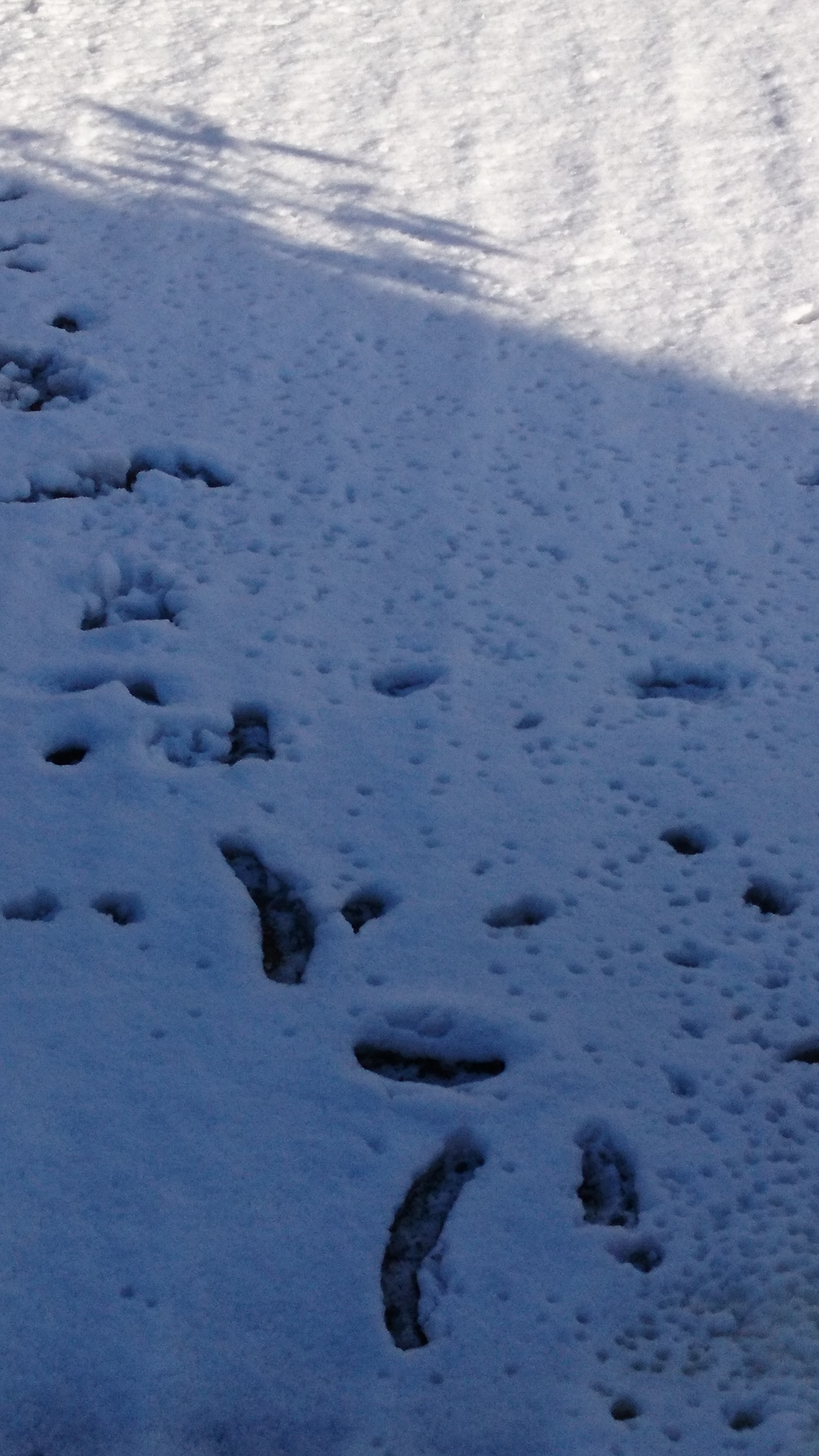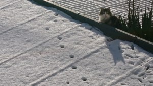 Je regarde la terrasse, et je m’amuse à voir les traces de glissade du chat sur la neige. Je pars à sa recherche, et je le retrouve en haut d’un toit, pas du tout rebuté par le froid, en pleine observation.