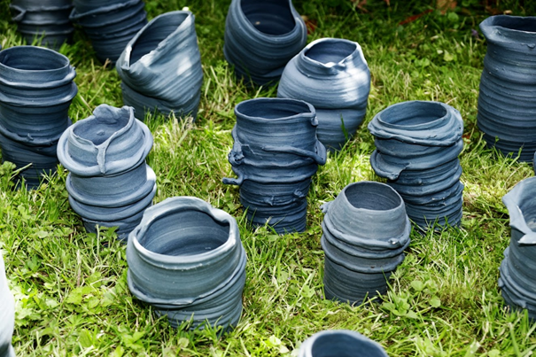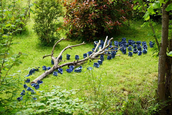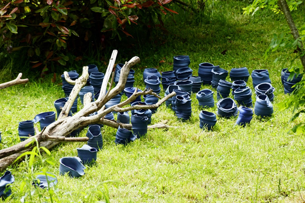 •••dans l’œuvre plastique : terre transformée, façonnée, modelée, colorée, agencée, témoin d’une habileté alliée à une force physique, d’une seconde vie à cette branche à terre qui reprend vie avec ces poteries bleues telles des fleurs ou des fruits sortis de Gaia.