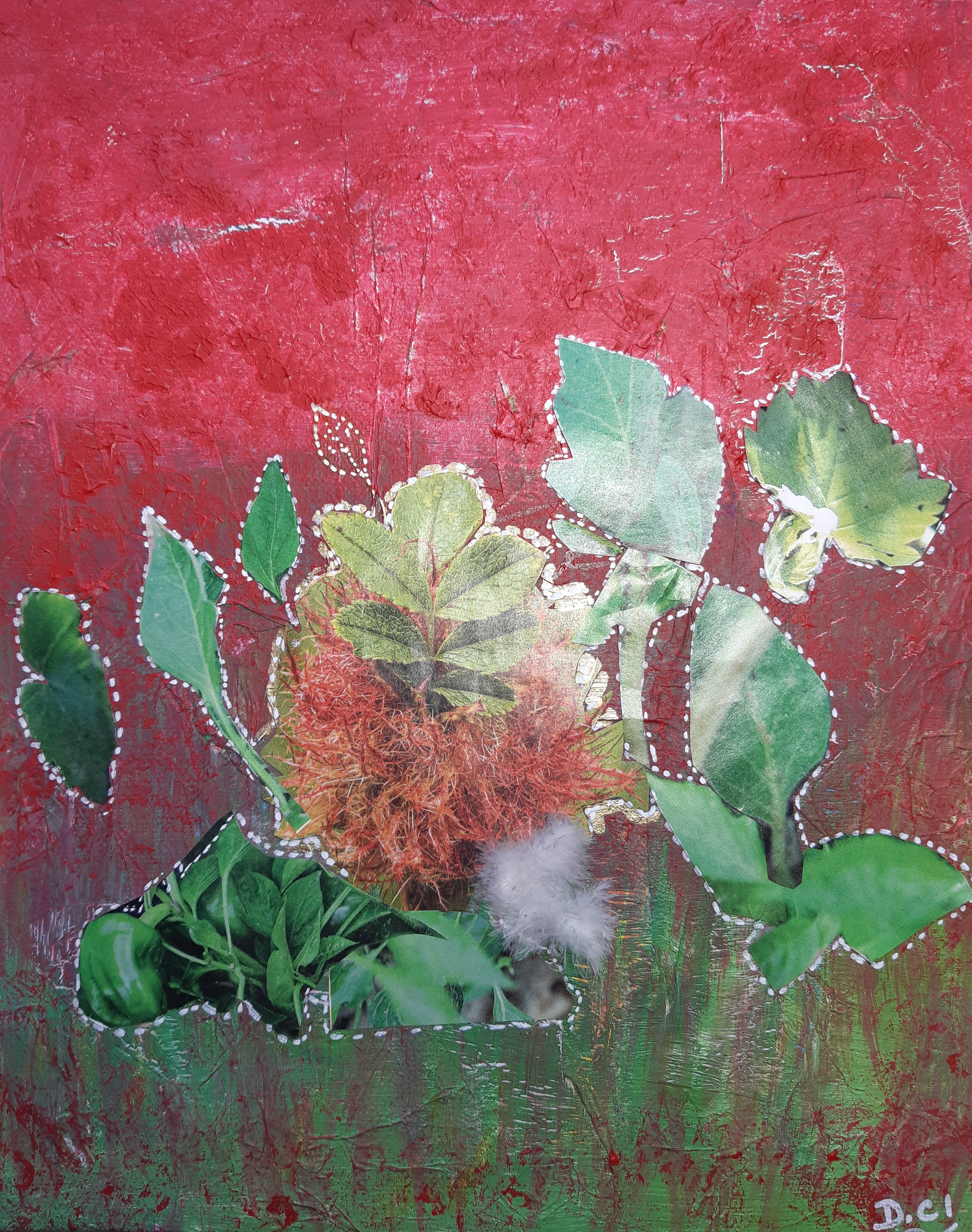 Je suis sensible aux couleurs et les couleurs de cette oeuvre m’ont immédiatement frappée par leur harmonie;2 couleurs complémentaires -vert et rouge- dégradées en camaieux.Les feuilles cernées comme d’un point de broderie donnent à l’ensemble une finesse dont je ne me lasse pas!Plus je la contemple ,plus je l’aime!Merci Danièle et Brigitte!