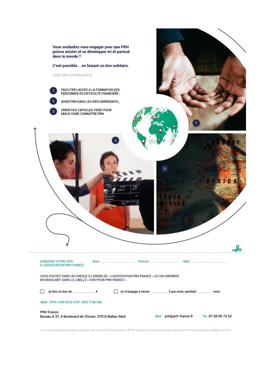 Pour contribuer à l’alimentation des bourses, vous pouvez faire un don à l’association PRH France (IBAN FR76 1940 6370 3767 1832 7105 666, ou 4 Boulevard de Chinon 37510 BALLAN-MIRE)