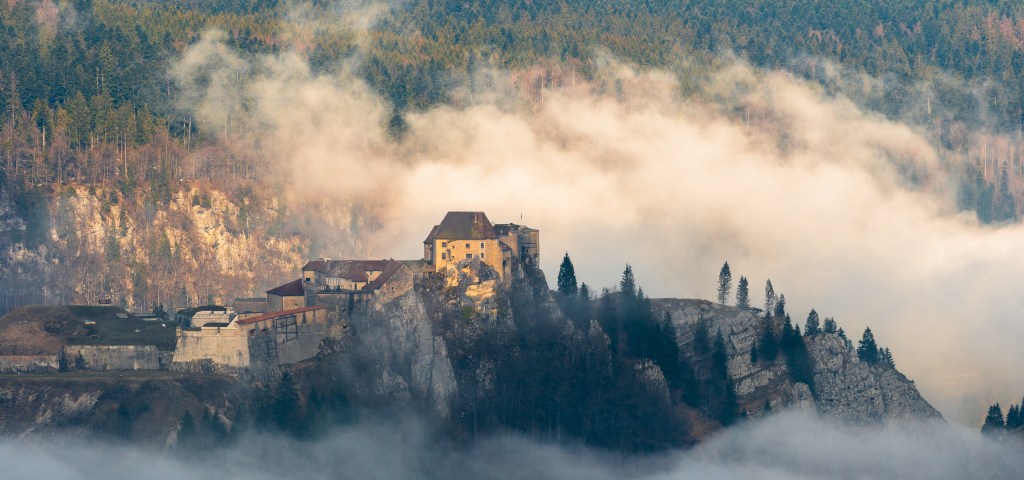 Un sentiment double: d’abord la solidité, la protection de ce lieu isolé sur son éperon rocheux, mais aussi la solitude et même l’isolement … pour la même raison. La brume qui monte et va bientôt tout envelopper: un cocon douillet ou alors un danger qui s’avance à couvert…