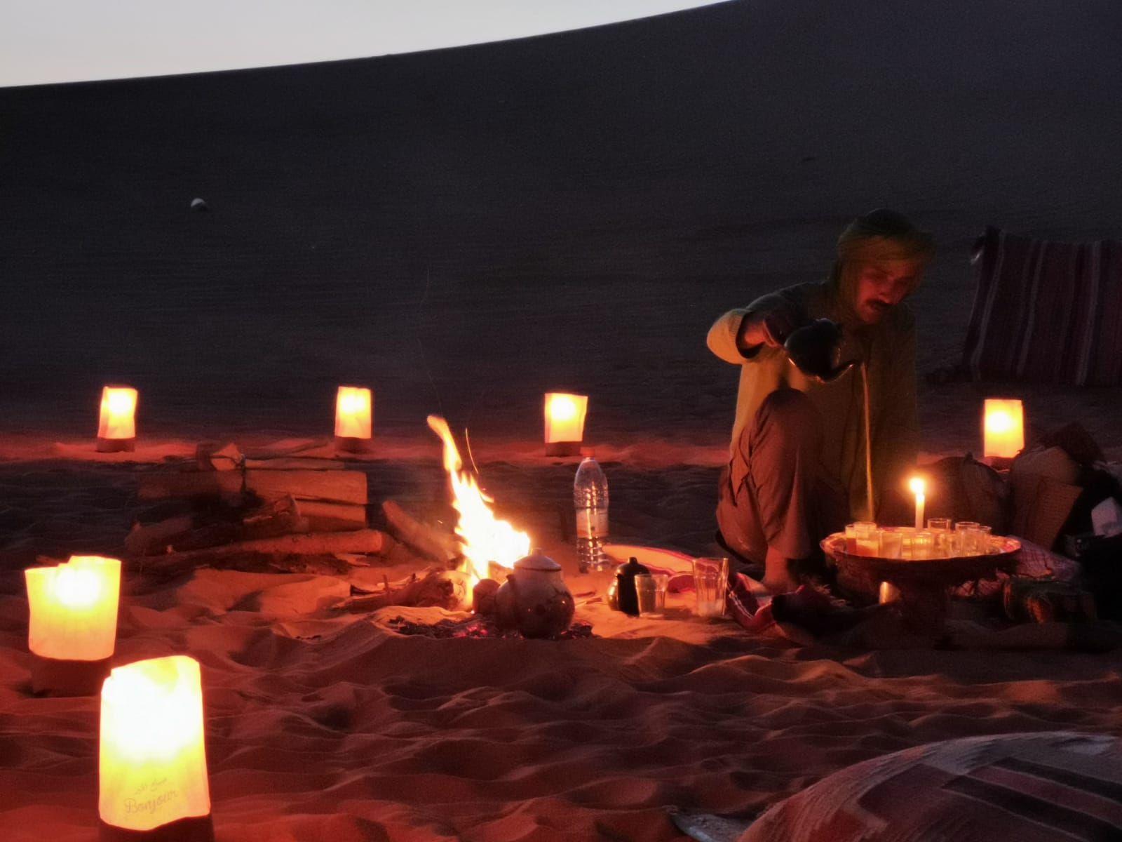 3. Simplicité, paix, accueil, attente des invités. Gestes emprunts d’amour et d’attention pour recevoir celui qui va venir, qui va arriver, c’est sûr. Je ne sais pas à quelle heure, mais peu importe: tout sera prêt. Surtout, mon être sera prêt, disponible. Dans ce désert, nous sommes liés, nous avons besoin l’un de l’autre pour avancer ensemble. La caravane n’est pas seulement vitale en ce lieu, mais elle me parle de la caravane humaine: là où je suis, ‘préparer le thé’ pour créer du lien, faire vivre l’amour et la bienveillance; la Fraternité avec les Hommes et la Terre.