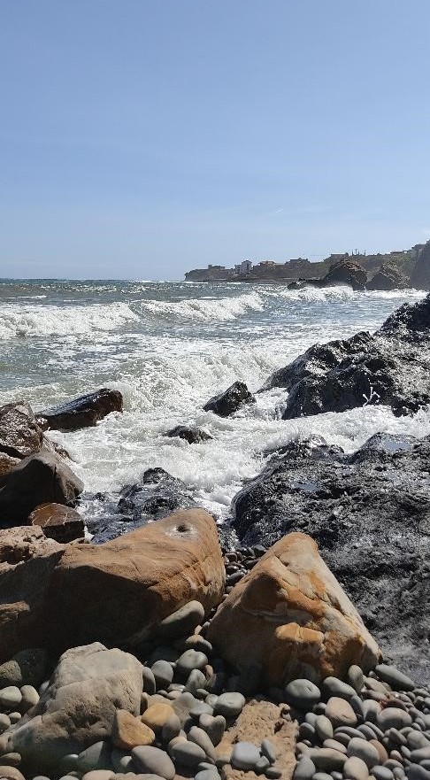 5. Merci… Ecueils, galets, rochers dans le mouvement inlassable de la mer … C’est impétueux et fort comme la vie et peut-être bien trop fort quelquefois … Néanmoins un ciel d’azur très grand, très haut … l’espoir apaise comme un brouhaha intérieur semblable à cette mer …
