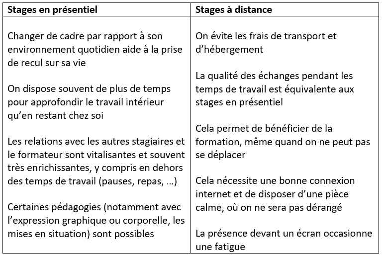 Il est certain que les stages en présentiel offrent un cadre plus favorable : les relations en dehors des temps de travail et le cadre souvent agréable favorisent la vitalisation et l’intériorisation. En outre, certains moyens pédagogiques efficaces ne sont possibles qu’en présentiel. Mais on constate que l’on peut faire aussi un travail très bénéfique à distance. Il vaut mieux se former à distance que ne pas se former du tout, c’est sûr !