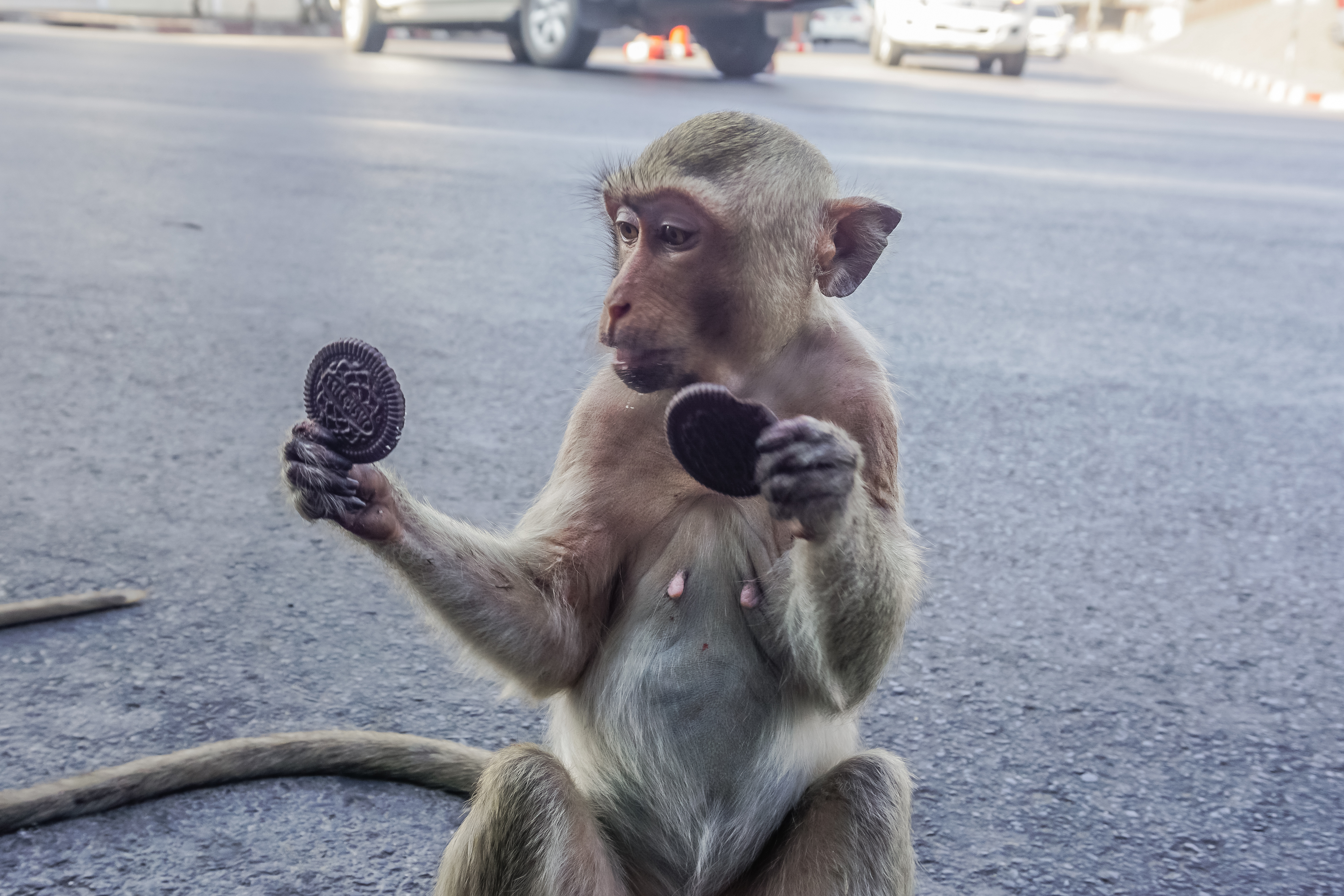 J’ai tout juste huit ans. Je suis en visite avec ma famille dans un joli parc animalier. Les maîtres des lieux sont d’adorables petits singes évoluant librement autour de nous. Il est quatre heures, l’heure de goûter. Je reçois mon biscuit au chocolat, le fameux BN, que je tiens fièrement. Voici qu’un petit singe espiègle, bien effronté, s’approche de moi. D’un geste vif, il s’empare de mon gâteau avant de se poster un peu à l’écart. De mes yeux ébahis, impuissante, je le vois ouvrir en deux mon biscuit, lécher goulûment tout le chocolat à l’intérieur, puis balancer négligemment le biscuit par-dessus la tête, avant de se remettre prestement en quête d’un nouveau trophée !