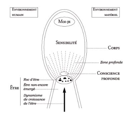 • Shema de la personneLa méthode sollicite les cinq instances de la personne, et pas seulement son intellect, ou ses émotions, ou encore un vécu corporel, comme dans certaines autres pratiques. C’est une approche globale. On sollicite l’être, où la personne peut puiser à ses ressources profondes (son goût de la vérité, son désir de progresser…), son «moi-je» où l’intelligence permet d’analyser, de comprendre, de faire des liens, de se projeter dans son futur proche, où sa liberté délibère en référence à sa conscience profonde en vue de décisions constructives, où sa volonté l’aide à être tenace dans son travail. Mais aussi sa sensibilité et son corps qui sont les matériaux de base : la personne vient, porteuse de toutes les sensations à contenu psychologique que ces deux instances éprouvent. L’instance du «moi-je» tient une place particulièrement importante. C’est le travail de connaissance et de conscientisation d’une part, de mise en oeuvre des potentialités d’autre part, qui permet de progresser. Une spécificité de notre méthode est effectivement de s’appuyer en grande part sur l’outil d’analyse des sensations à contenu psychologique mis au point par André Rochais, fondateur de PRH.