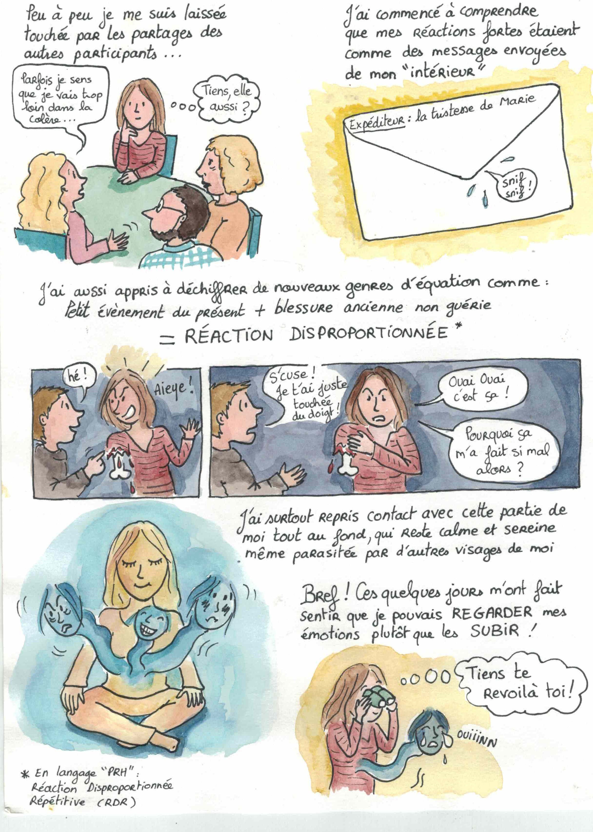 Nous publions en deux parties une BD écrite par Marie Fernandez, qui suit la formation PRH. Elle nous partage, à sa manière, comment elle a appris à gérer ses émotions. Lire la suite « Les émotions de Marie (1/2) »