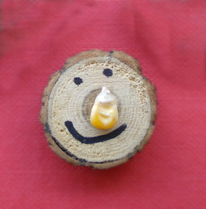 L’enfant qui veut « vivre pour être heureuse » fouille au fond de son petit seau et me sort une fine rondelle de bois, sur laquelle est symbolisé un visage riant. Elle me la tend :